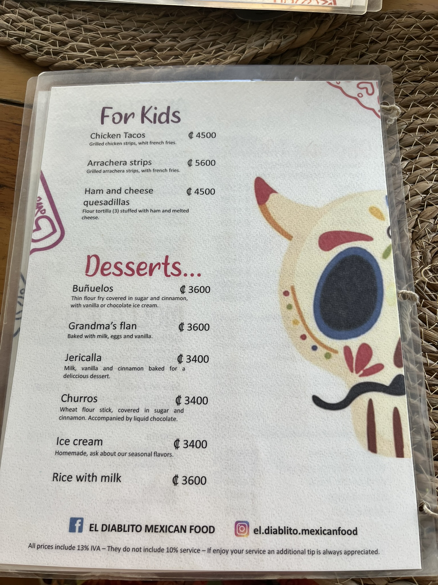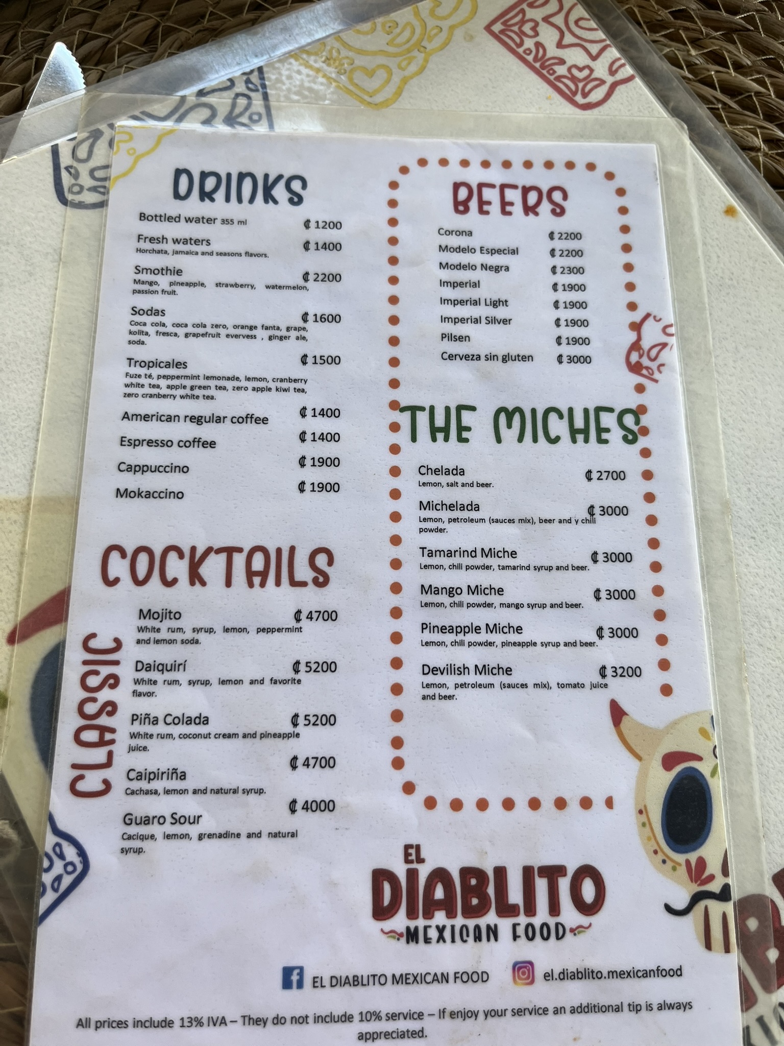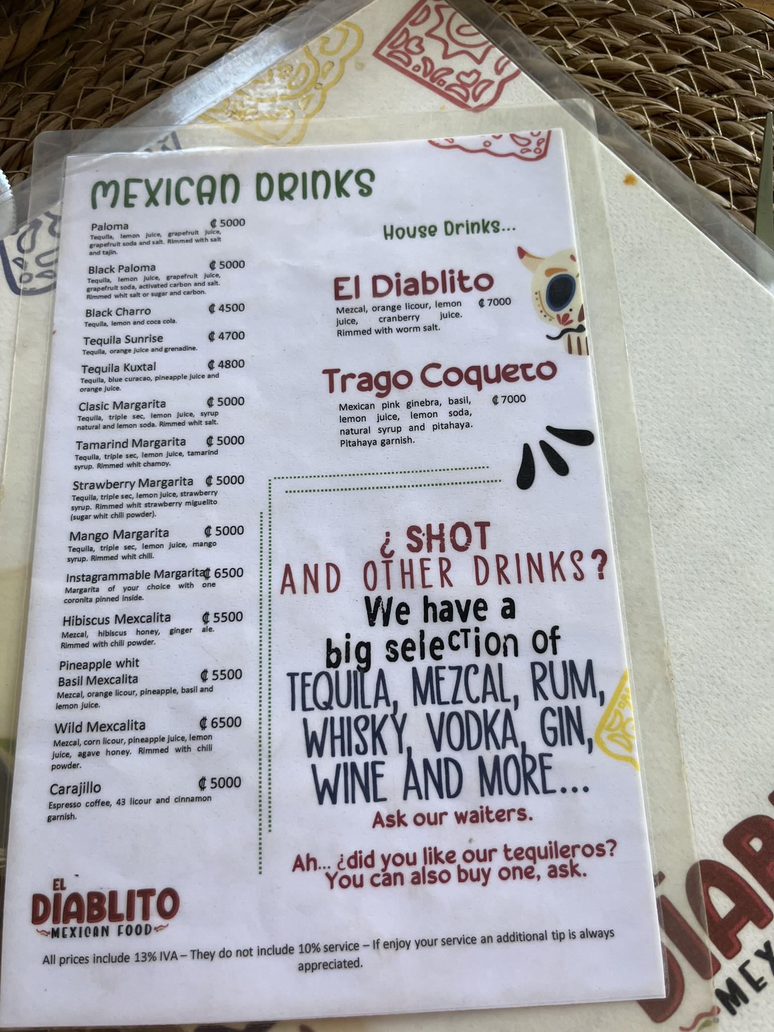 This was our first time eating at El Diablito in Potrero Costa Rica.  We came about 4pm, we like to eat early.  We were the only ones in the restaurant.  The waitress was very nice, we ordered Margaritas, a classic and a Tamarind – both delicious.