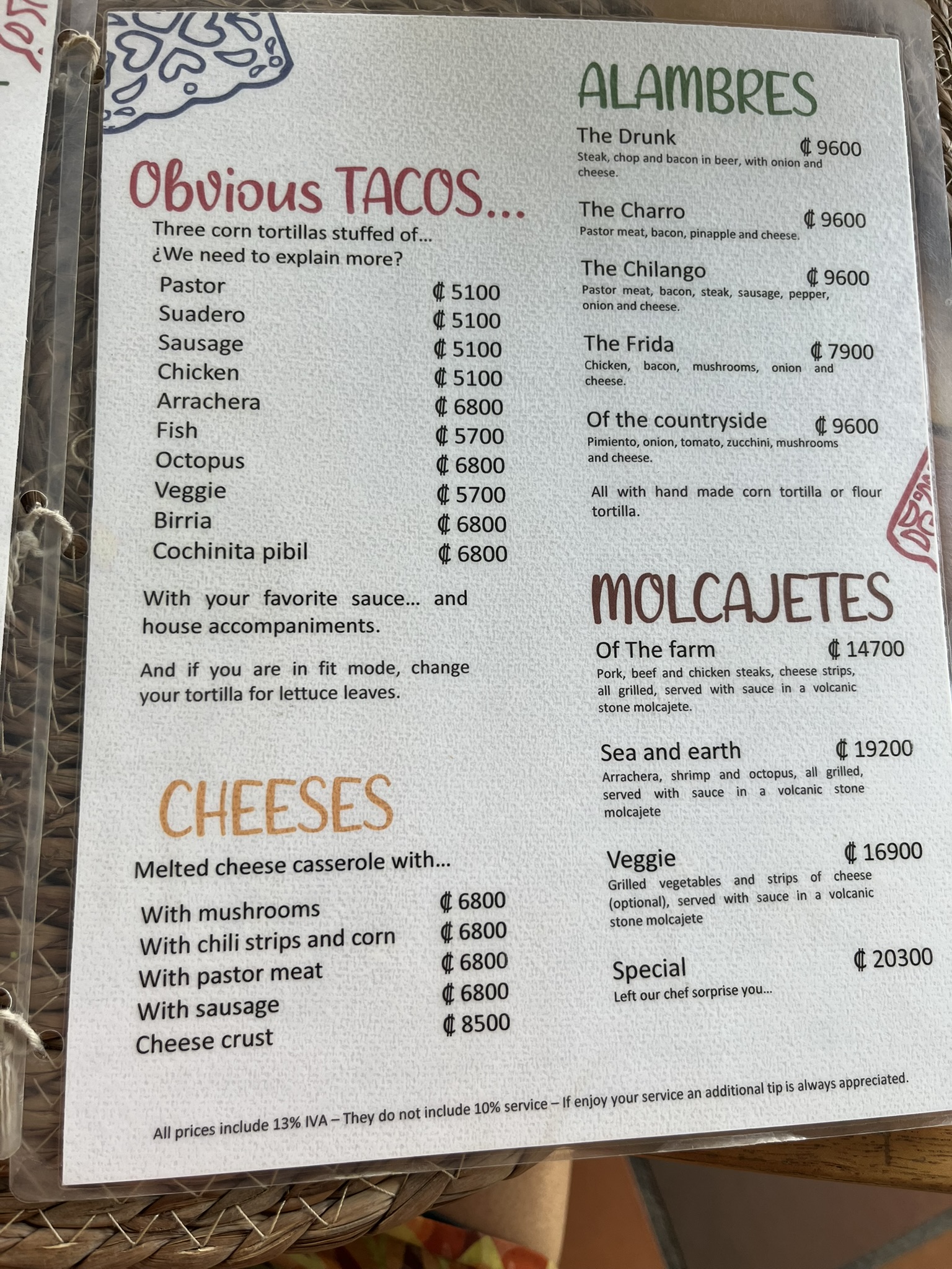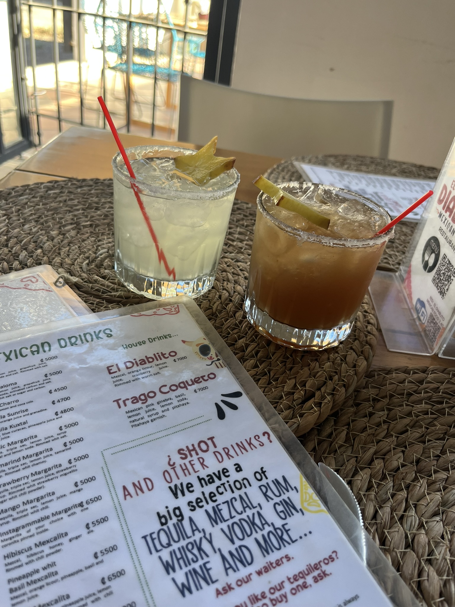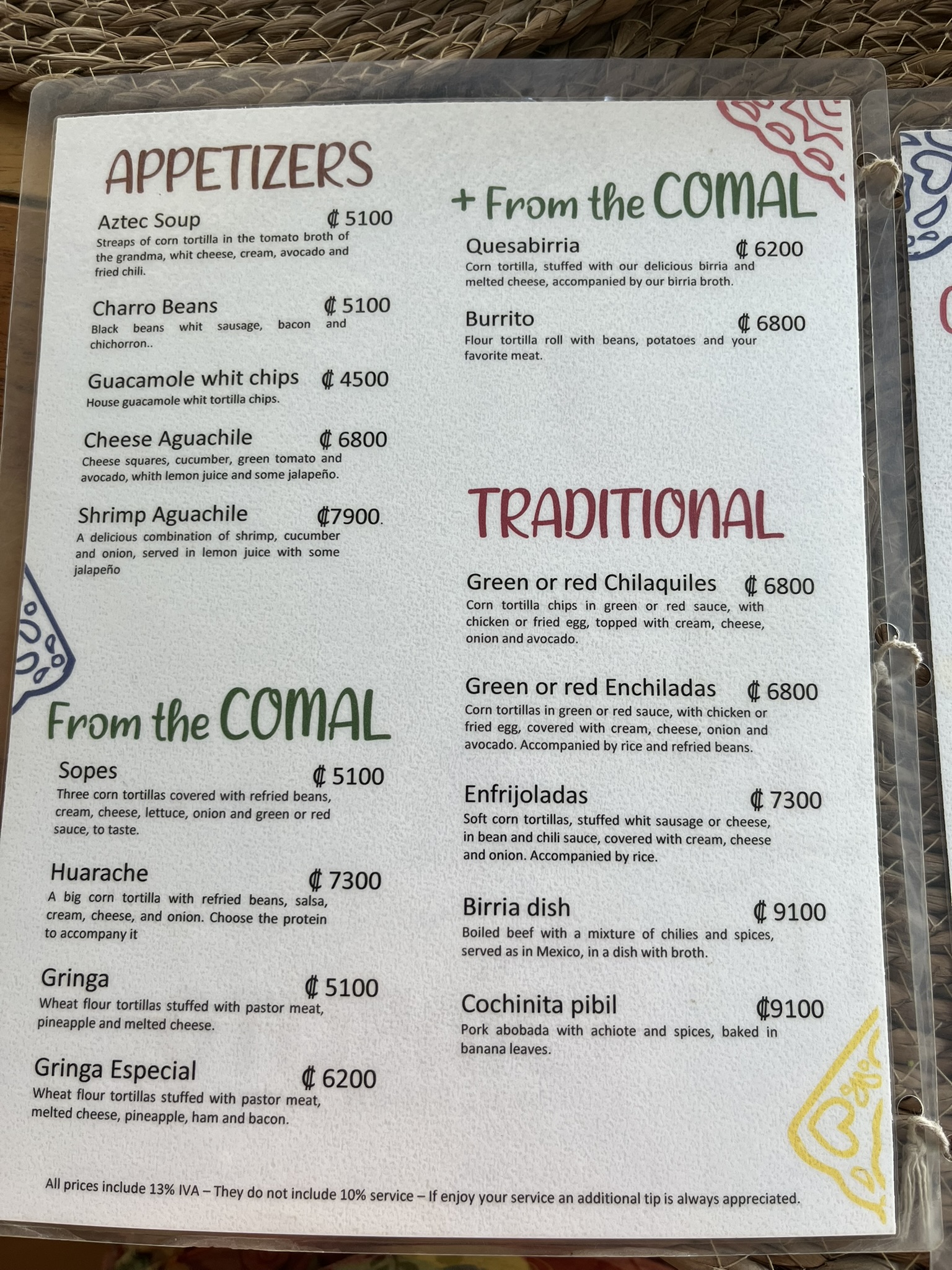This was our first time eating at El Diablito in Potrero Costa Rica.  We came about 4pm, we like to eat early.  We were the only ones in the restaurant.  The waitress was very nice, we ordered Margaritas, a classic and a Tamarind – both delicious.
